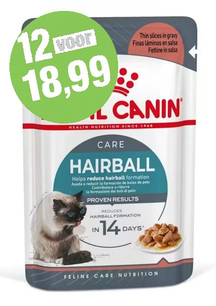 Royal Canin Hairball Care in Gravy (brokjes in saus) is een complete en uitgebalanceerde voeding die speciaal is ontwikkeld om de vorming van haarballen te helpen verminderen. Deze voeding is samengesteld om de darmpassage te helpen bevorderen en zo ingeslikte haren via de ontlasting te laten uitscheiden. Royal Canin Hairball Care heeft bewezen resultaten. Uit een interne studie* van Royal Canin blijkt dat deze voeding de vorming van haarballen bij de deelnemende katten na 14 dagen gebruik van het Hairball Care-voedingsprogramma (droog- en natvoeding) vermindert. Royal Canin Hairball Care is ook verkrijgbaar in de vorm van brokjes in gelei of droogvoeding (brokken). Door natvoeding en droogvoeding te combineren, bied je je kat de variatie waar ze zo van houdt.