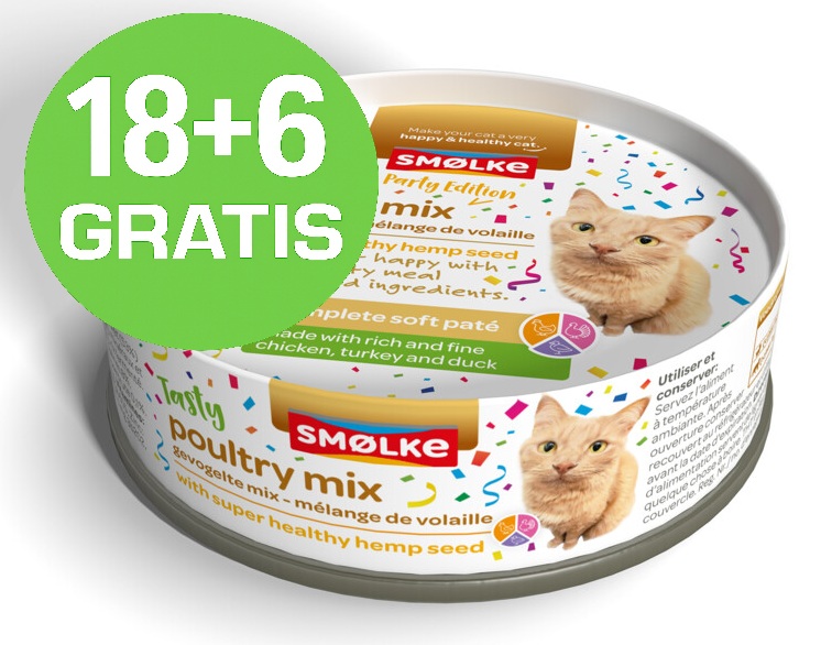 Smølke Soft Paté Party Edition is een ultra lekkere maaltijd voor feestelijke gelegenheden! De heerlijke combinatie van kip, kalkoen en eend vormt een echte verwennerij voor jouw kat! De paté zit boordevol vlees en is aangevuld met de gezonde superfoods hennepzaad en zalmolie. Lekker als traktatie maar ook perfect als complete maaltijd!