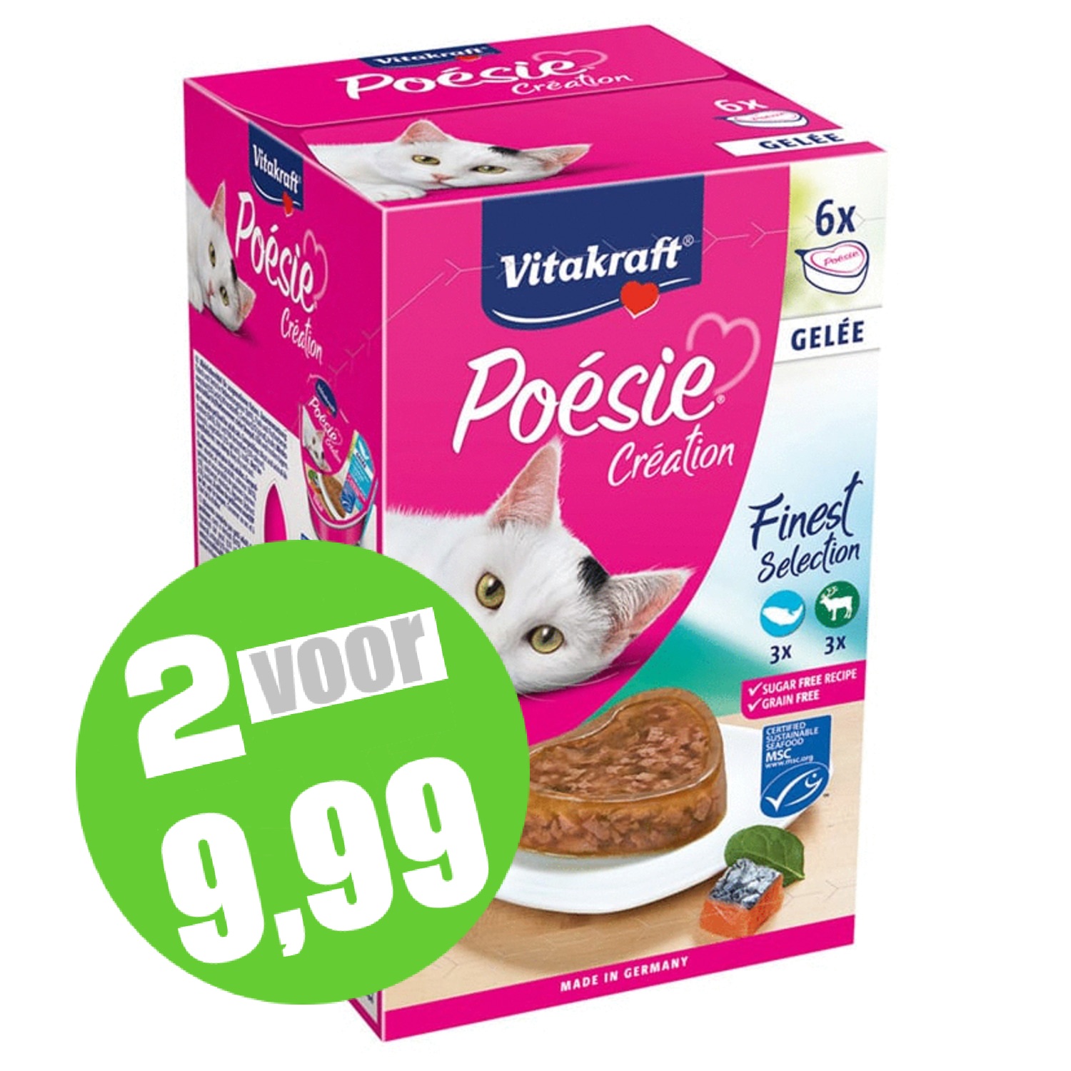 Multipack Poésie met de smaken zalm & spinazie in gelei en wild in cranberry-gelei. Elke schaal Poésie bevat een onweerstaanbare smaak en heerlijke verse ingrediënten. Deze volledige natvoeding is geheel op de voedingsbehoeften van volwassen katten afgestemd en is van de hoogste kwaliteit. Poésie wordt volgens een suikervrije receptuur bereid en bevat geen kunstmatige kleurstoffen en conserveringsmiddelen.