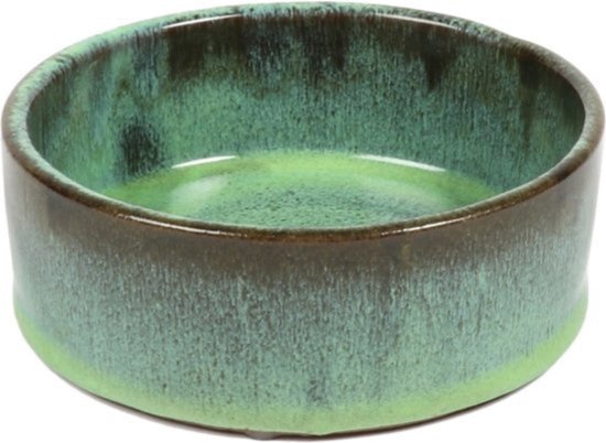 voer als water geschikt is. Met een wanddikte van ongeveer 8 mm kan de Jasper wel tegen een stootje. De vintage groene, glazuren afwerking geven er een speelse, eigentijdse draai aan. De onderkant van de schaal is voorzien van rubberen nopjes om krassen op de vloer tegen te gaan.