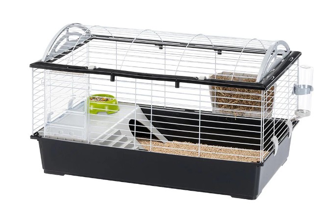 De kooi wordt compleet geleverd met accessoires: voerbak, drinkbak, voerbakje en een huisje met een opstaande rand zodat uw huisdier er gemakkelijk op kan klimmen.
