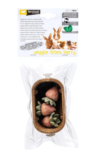 Dankzij de drievoudige functie – aanvullende traktatie, kauwsnack en tandverzorgende snack – is Veggie Bites Strawberry een praktische oplossing om de dagelijkse omgeving van kleine huisdieren te verrijken. Gemaakt met haverzemelen, tarwestengels, erwtenvezels, maïsmeel en maïsstengels, plantaardige glycerine, timotheegras, pompoen, gerstegras, wortel, alfalfa, rode biet, appel, aardbei en kurkuma, biedt het variatie en natuurlijke smaken in elke hap.