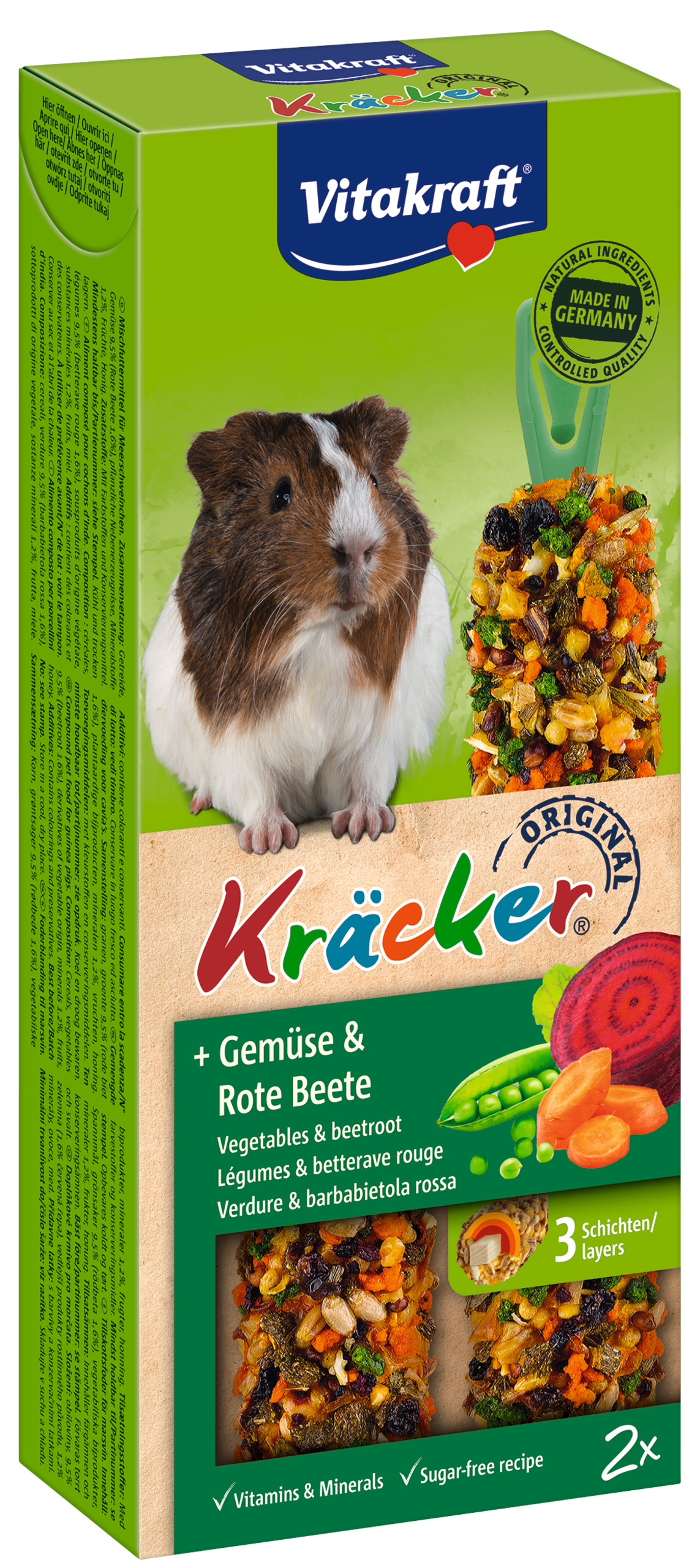 De orginele Vitakraft Kräckers zijn een verantwoorde lekkernij en bevatten lekkere granen, groente en bieten op een natuurlijk knabbelhoutje. De Kräckers zijn lekker van smaak en 3-voudig gebakken waardoor de ingrediënten stevig vastzitten en de cavia bezig wordt gehouden zoals dit in de vrije natuur ook gebeurt. Dit geeft de cavia de nodige beweging en zorgt ervoor dat hij zijn tanden op natuurlijke wijze kan afslijten. De Kräckers zijn afgestemd op de voedingsbehoefte van de cavia. Het Vital-Complex voorkomt gebreksverschijnselen en zorgt voor extra vitaliteit van het dier. Met waardevolle vitamines, extra vitamine C en bereid volgens een suikervrije receptuur.