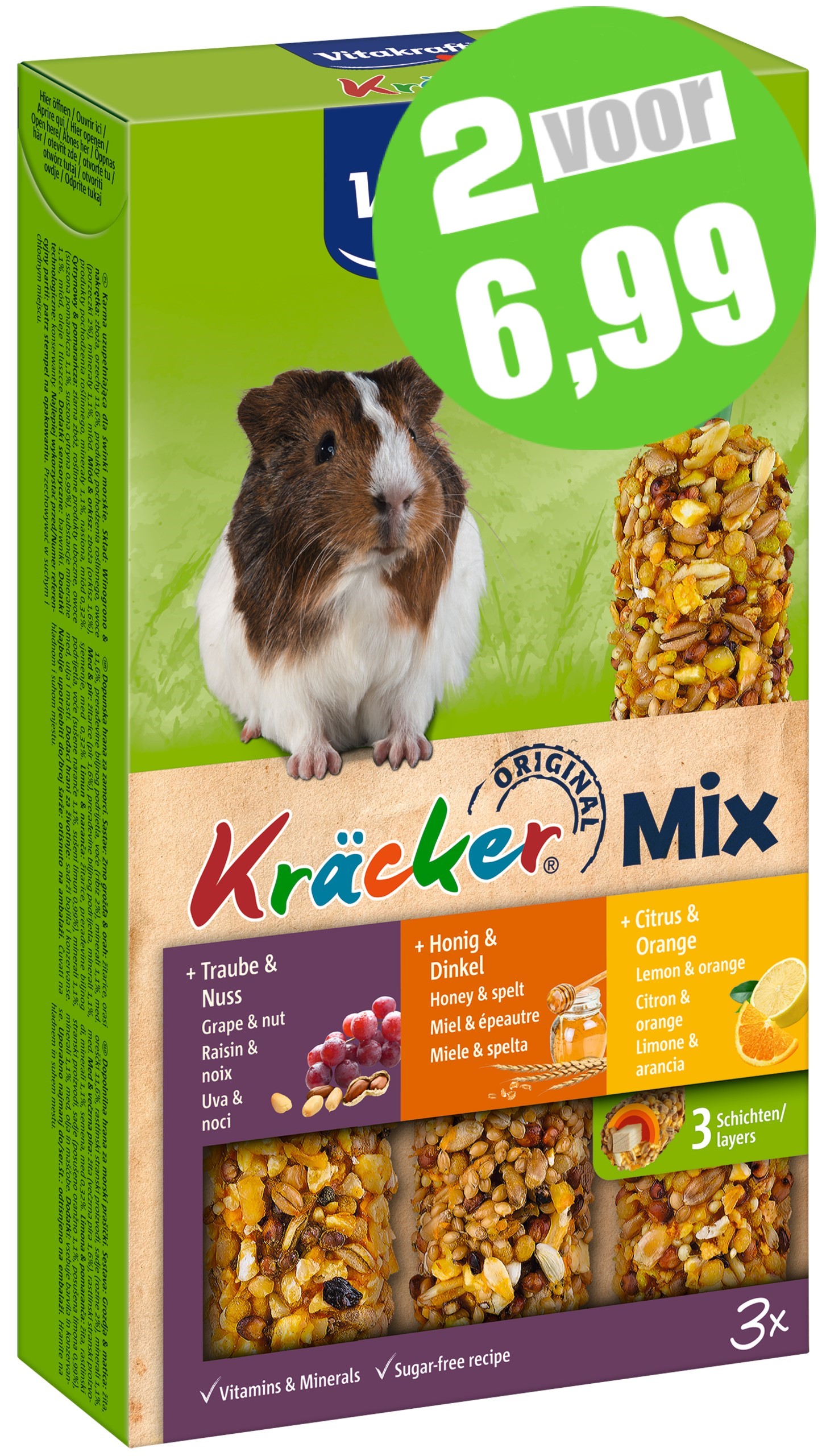De orginele Vitakraft Trio Mix Kräckers zijn een verantwoorde lekkernij, 3 verschillende smaken Kräckers in de mix met lekkere granen, druiven, honing en citrus op een natuurlijk knabbelhoutje. De Kräckers zijn lekker van smaak en 3-voudig gebakken waardoor de ingrediënten stevig vastzitten en de cavia bezig wordt gehouden zoals dit in de vrije natuur ook gebeurt. Dit geeft de cavia de nodige beweging en zorgt ervoor dat hij zijn snijtanden op natuurlijke wijze kan afslijten. De Kräckers zijn afgestemd op de voedingsbehoefte van de cavia. Het Vital-Complex voorkomt gebreksverschijnselen en zorgt voor extra vitaliteit van het dier. Met waardevolle vitamines, extra vitamine C en bereid volgens een suikervrije receptuur.
