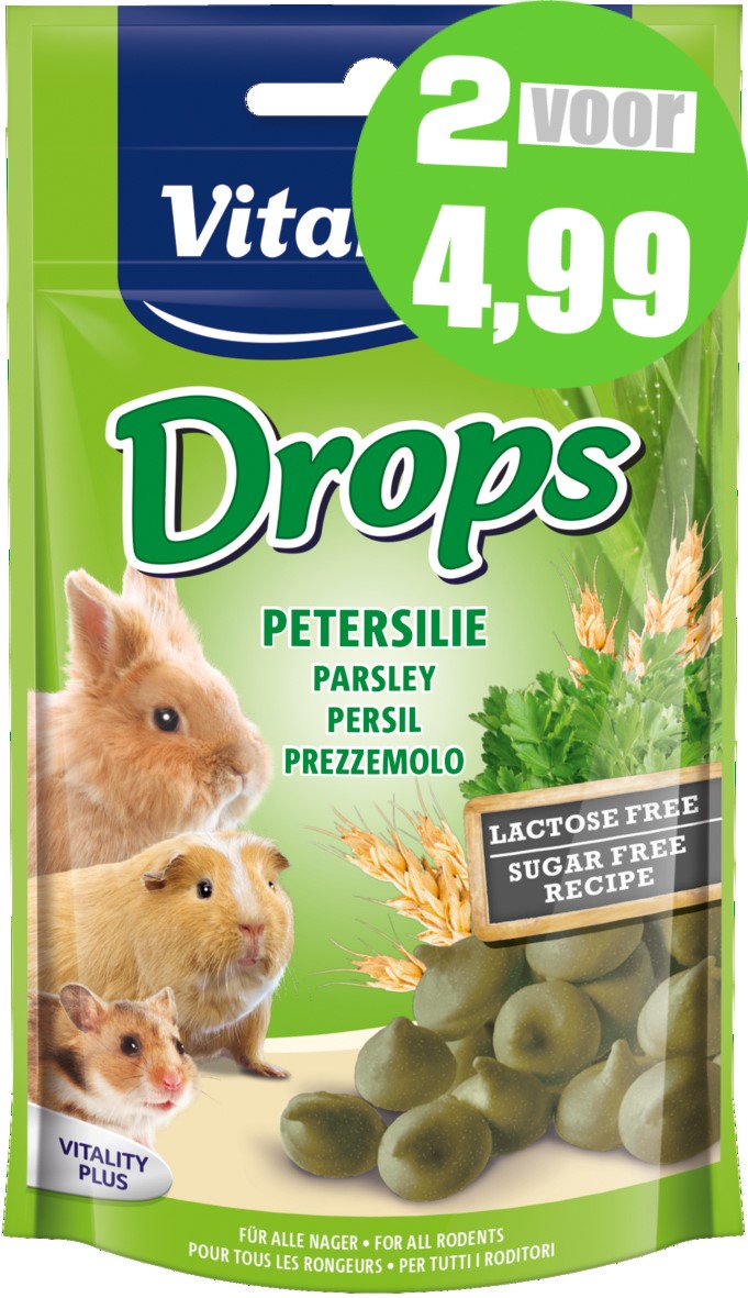 Heerlijke snoepjes met lekkere peterselie. Lactosevrij en dus bijzonder goed verteerbaar. Deze populaire Drops hebben een perfecte portiegrootte. Zeer geschikt als tussendoortje en ook ideaal als beloning. De Drops zijn geschikt voor alle knaagdieren en konijnen. Bereid volgens een suikervrije receptuur, zonder kunstmatige kleurstoffen, smaakversterkers en conserveringsmiddelen. Verpakt in een hersluitbare stazak.