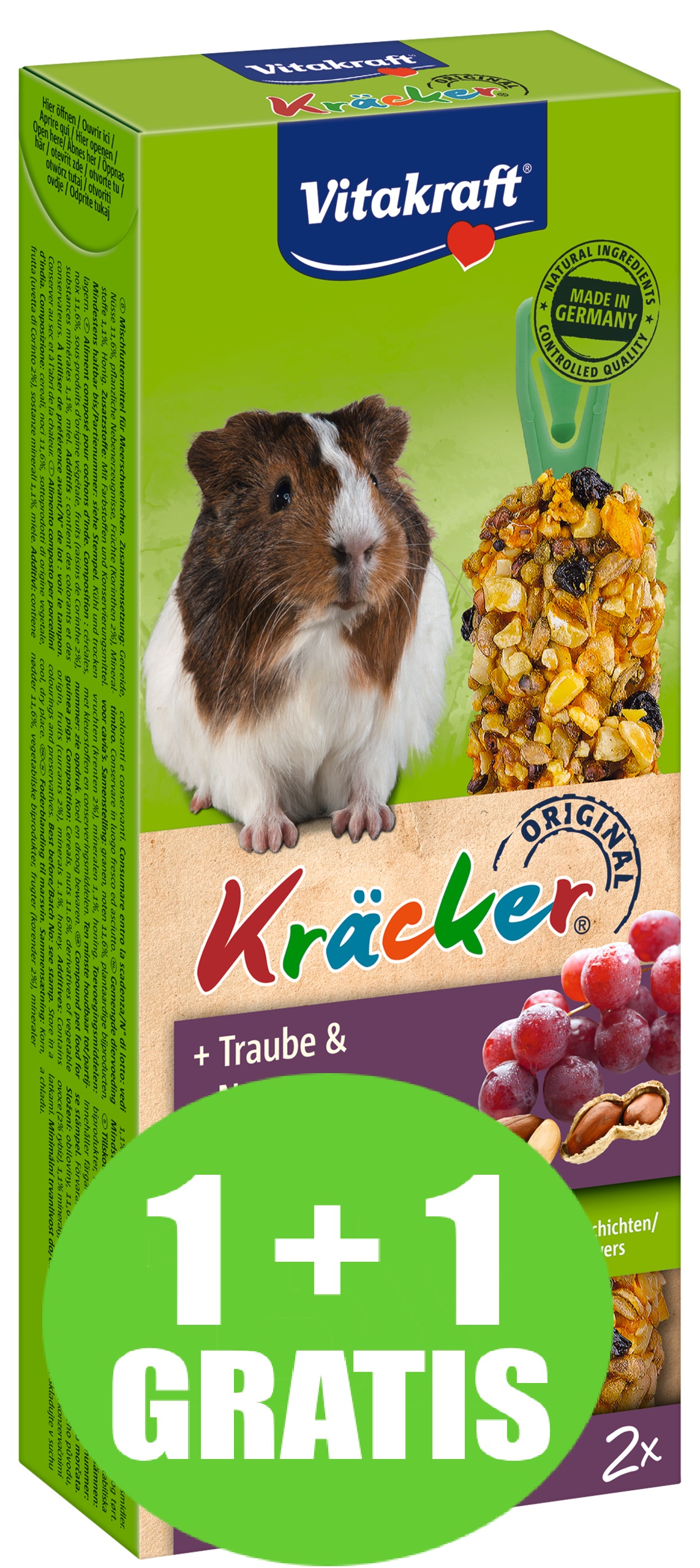 De orginele Vitakraft Kräckers zijn een verantwoorde lekkernij en bevatten lekkere granen, druiven en noten op een natuurlijk knabbelhoutje. De Kräckers zijn lekker van smaak en 3-voudig gebakken waardoor de ingrediënten stevig vastzitten en de cavia bezig wordt gehouden zoals dit in de vrije natuur ook gebeurt. Dit geeft de cavia de nodige beweging en zorgt ervoor dat hij zijn tanden op natuurlijke wijze kan afslijten. De Kräckers zijn afgestemd op de voedingsbehoefte van de cavia. Het Vital-Complex voorkomt gebreksverschijnselen en zorgt voor extra vitaliteit van het dier. Met waardevolle vitamines, extra vitamine C en bereid volgens een suikervrije receptuur.