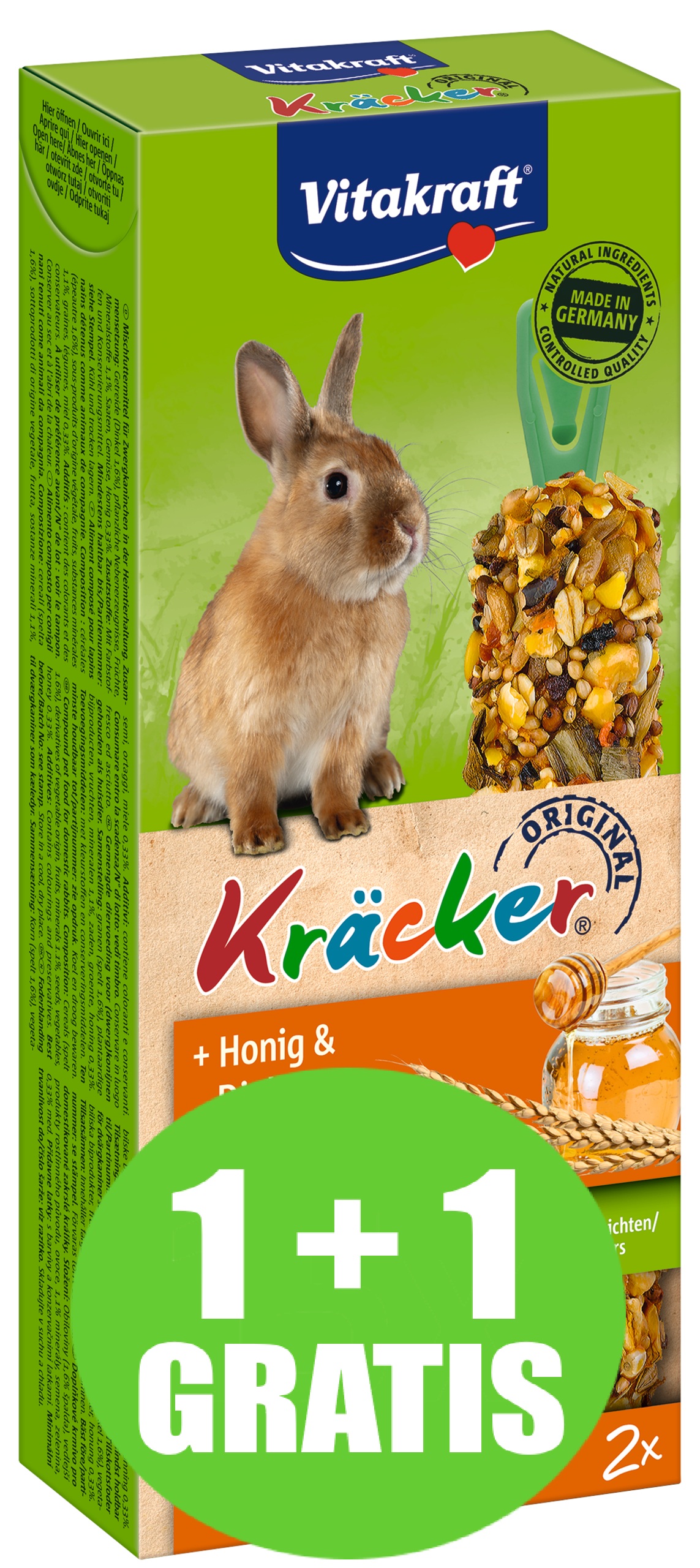 De orginele Vitakraft Kräckers zijn een verantwoorde lekkernij en bevatten lekkere granen, honing en spelt op een natuurlijk knabbelhoutje. De Kräckers zijn lekker van smaak en 3-voudig gebakken waardoor de ingrediënten stevig vastzitten en het konijn bezig wordt gehouden zoals dit in de vrije natuur ook gebeurt. Dit geeft het konijn de nodige beweging en zorgt ervoor dat hij zijn snijtanden op natuurlijke wijze kan afslijten. De Kräckers zijn afgestemd op de voedingsbehoefte van het konijn. Het Vital-Complex voorkomt gebreksverschijnselen en zorgt voor extra vitaliteit van het dier. Met waardevolle vitamines en bereid volgens een suikervrije receptuur.