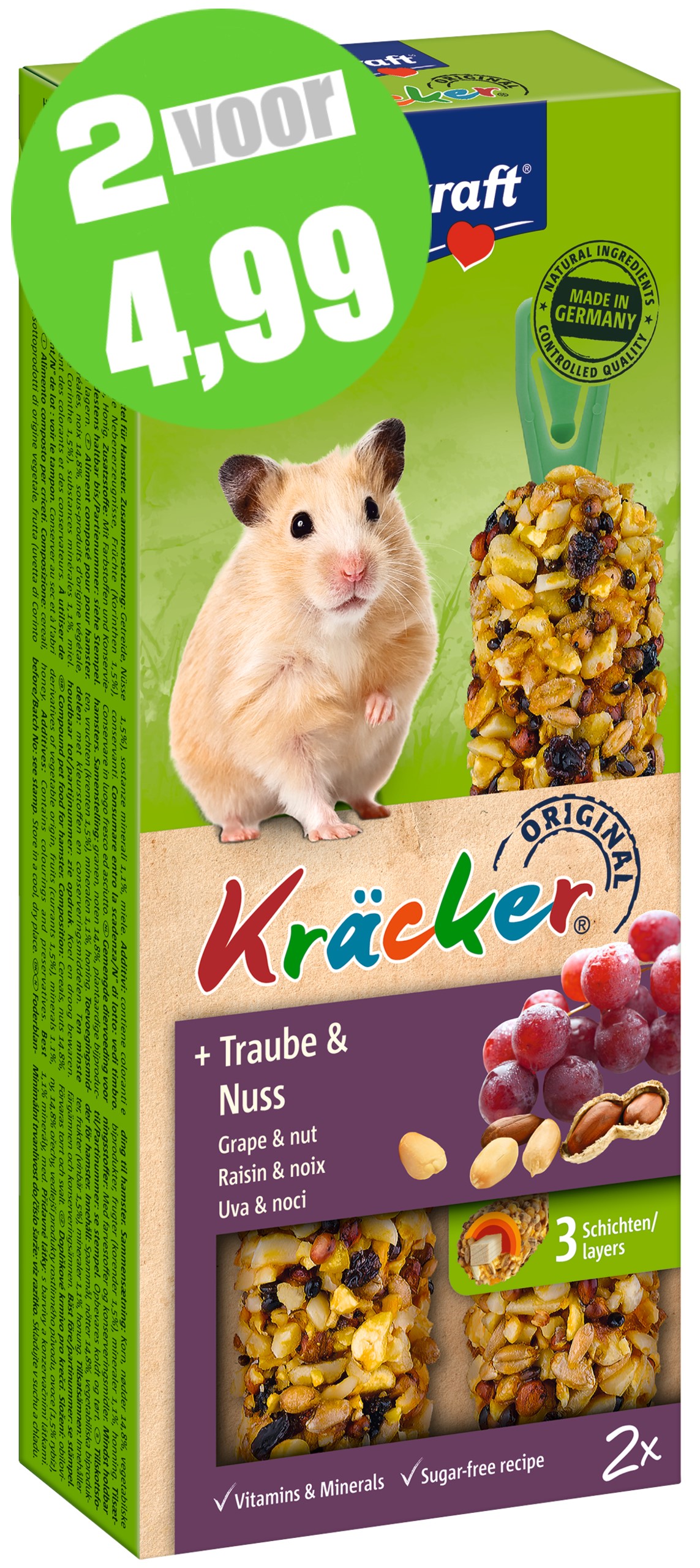Vitakraft Kräckers zijn een verantwoorde lekkernij en bevatten lekkere granen, druiven en noten op een natuurlijk knabbelhoutje. De Kräckers zijn lekker van smaak en 3-voudig gebakken waardoor de ingrediënten stevig vastzitten en de hamster actief bezig is met zijn voedsel net zoals in de natuur. Dit geeft de hamster de nodige beweging en zorgt ervoor dat hij zijn tanden op natuurlijke wijze kan afslijten. De Kräckers zijn op de voedingsbehoeften van de hamster afgestemd. De Kräckers bevatten waardevolle vitamines en zijn volgens een suikervrije receptuur bereid.