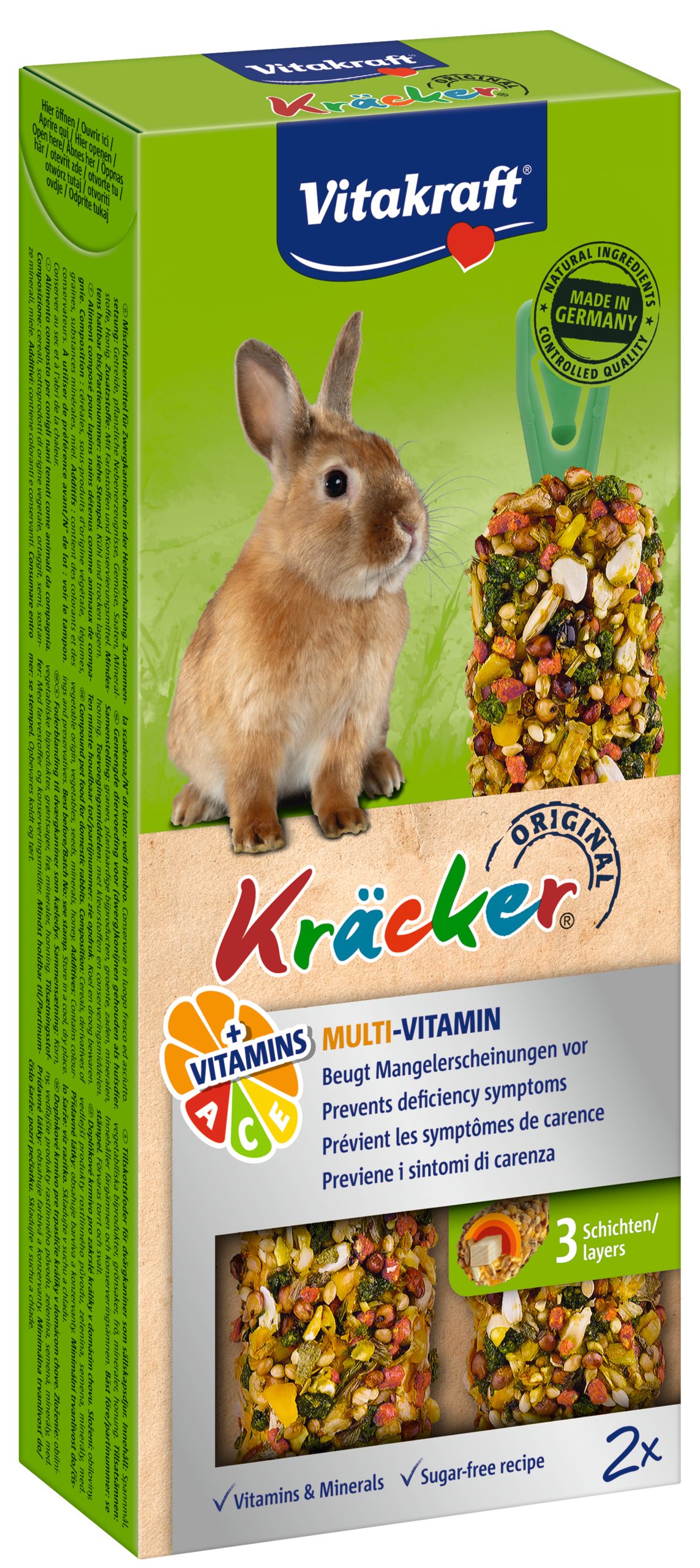 De functionele Vitakraft Kräckers zijn een verantwoorde lekkernij en bevatten lekkere granen op een natuurlijk knabbelhoutje. Deze functionele Kräcker bevat extra vitamine A, C en E die tekorten voorkomen en het immuunsysteem van het konijn ondersteunen. De Kräckers zijn lekker van smaak en 3-voudig gebakken waardoor de ingrediënten stevig vastzitten en het konijn bezig wordt gehouden zoals dit in de vrije natuur ook gebeurt. Dit geeft het konijn de nodige beweging en zorgt ervoor dat hij zijn snijtanden op natuurlijke wijze kan afslijten. De Kräckers zijn afgestemd op de voedingsbehoefte van het konijn. Het Vital-Complex voorkomt gebreksverschijnselen en zorgt voor extra vitaliteit van het dier. Met waardevolle vitamines en bereid volgens een suikervrije receptuur.