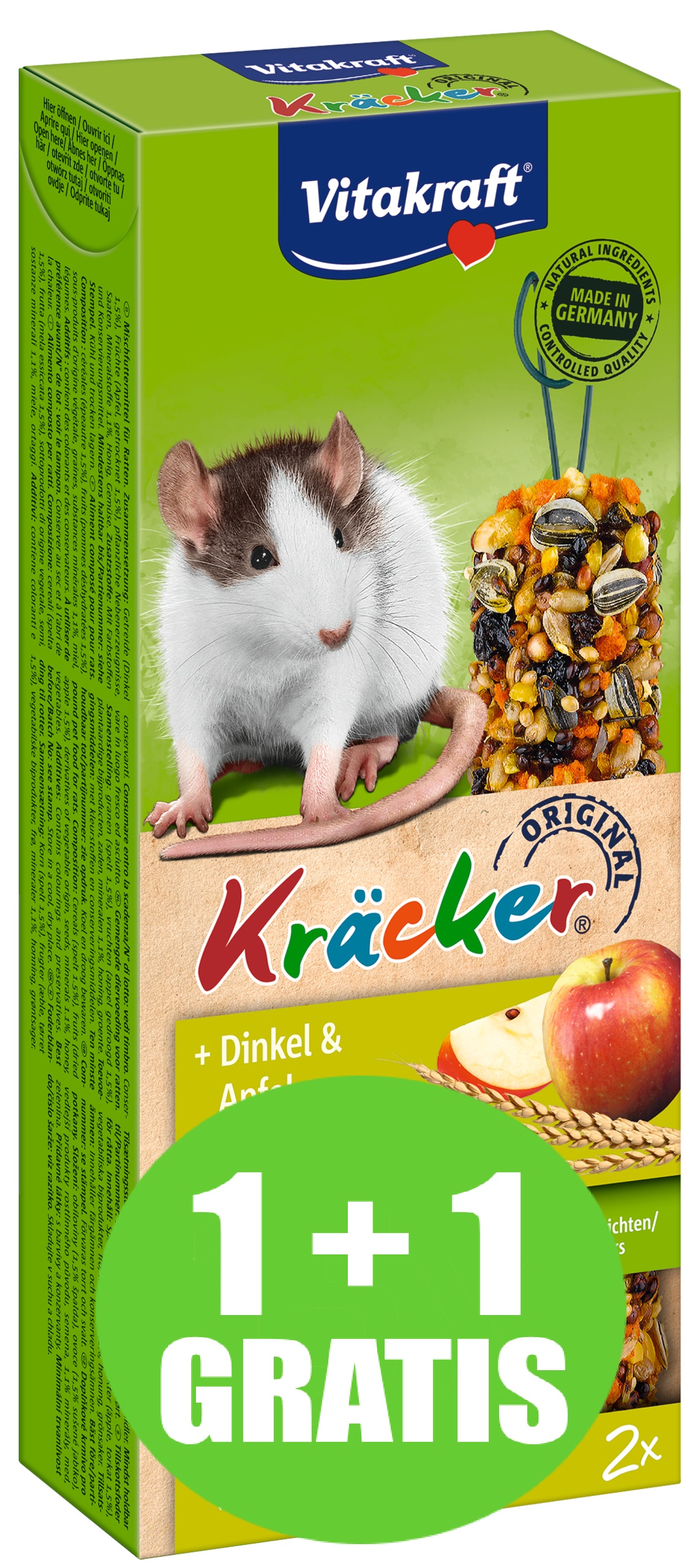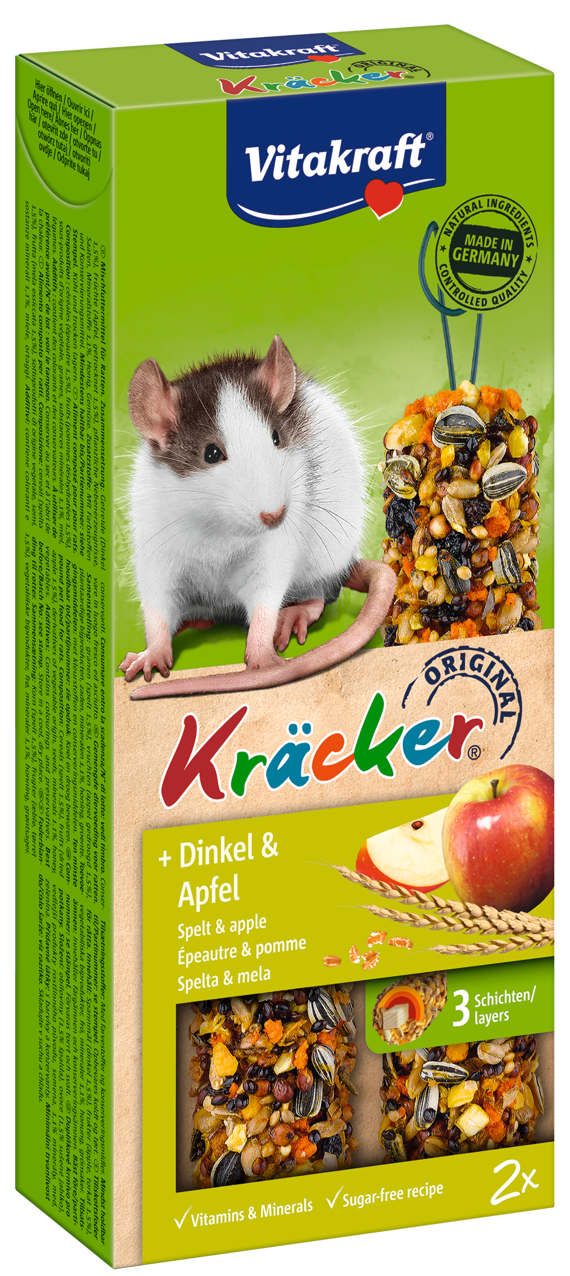 De orginele Vitakraft Kräckers zijn een verantwoorde lekkernij en bevatten lekkere granen, spelt en appel op een natuurlijk knabbelhoutje. De Kräckers zijn lekker van smaak en 3-voudig gebakken waardoor de ingrediënten stevig vastzitten en de rat bezig wordt gehouden zoals dit in de vrije natuur ook gebeurt. Dit geeft de rat de nodige beweging en zorgt ervoor dat hij zijn tanden op natuurlijke wijze kan afslijten. De Kräckers zijn afgestemd op de voedingsbehoefte van de rat. Het Vital-Complex voorkomt gebreksverschijnselen en zorgt voor extra vitaliteit van het dier. Met waardevolle vitamines en bereid volgens een suikervrije receptuur.