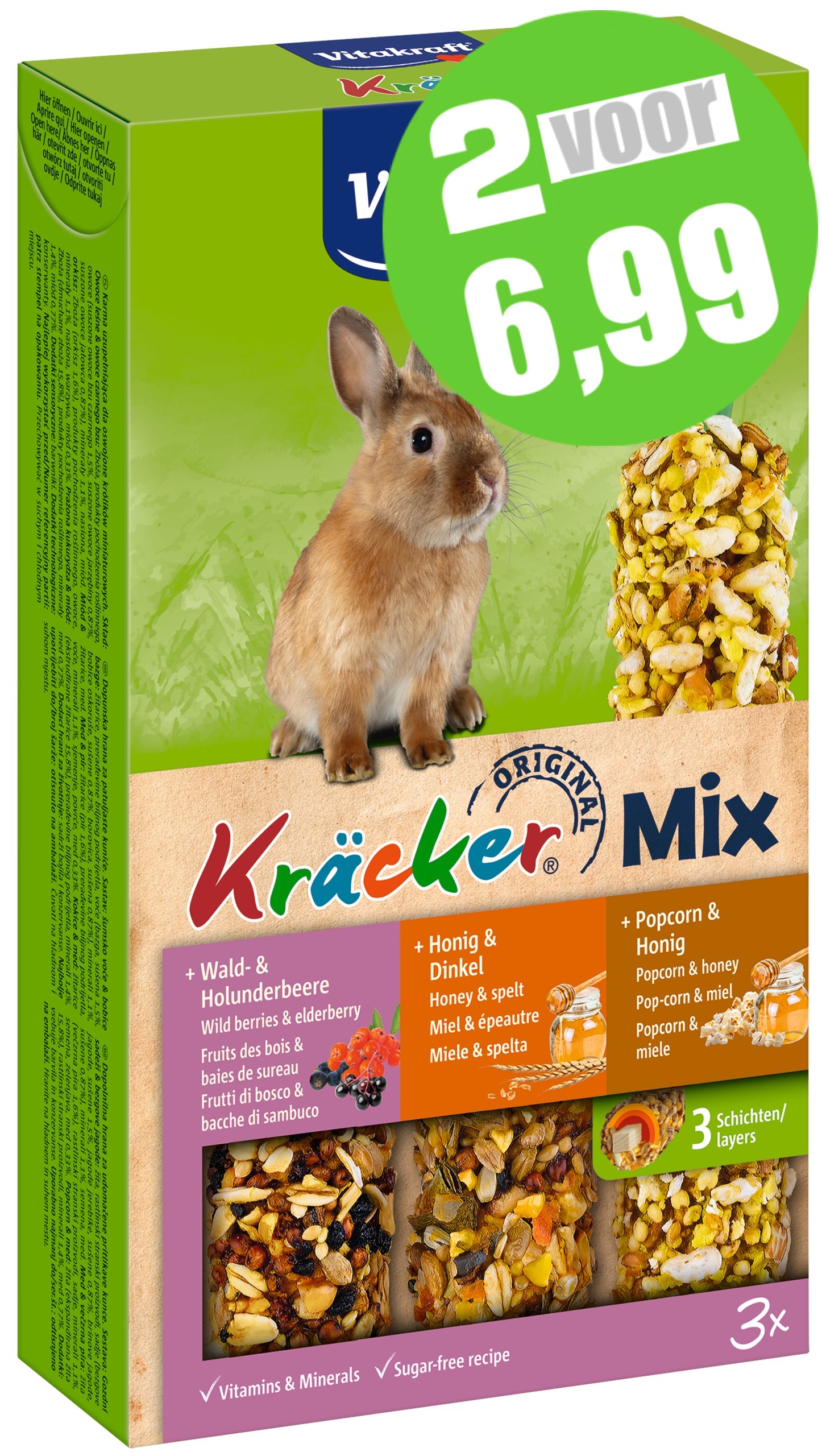 De orginele Vitakraft Trio Mix Kräckers zijn een verantwoorde lekkernij, 3 verschillende smaken Kräckers in de mix met lekkere granen, bosbessen, honing en popcorn op een natuurlijk knabbelhoutje. De Kräckers zijn lekker van smaak en 3-voudig gebakken waardoor de ingrediënten stevig vastzitten en het konijn bezig wordt gehouden zoals dit in de vrije natuur ook gebeurt. Dit geeft het konijn de nodige beweging en zorgt ervoor dat hij zijn snijtanden op natuurlijke wijze kan afslijten. De Kräckers zijn afgestemd op de voedingsbehoefte van het konijn. Het Vital-Complex voorkomt gebreksverschijnselen en zorgt voor extra vitaliteit van het dier. Met waardevolle vitamines en bereid volgens een suikervrije receptuur.