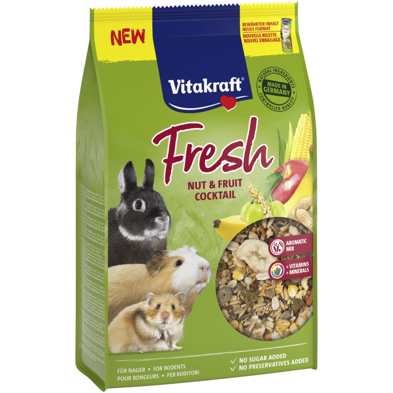 Vitakraft Fresh ondersteunt ook de gezondheid van je huisdier. Zo bevat de mix vitamines A en D, maar ook mineralen als selenium, zink, jodium, mangaan, ijzer én koper! Daarnaast bevat deze knaagdiersnack vezels om het gebit van je vloerpruik te onderhouden.