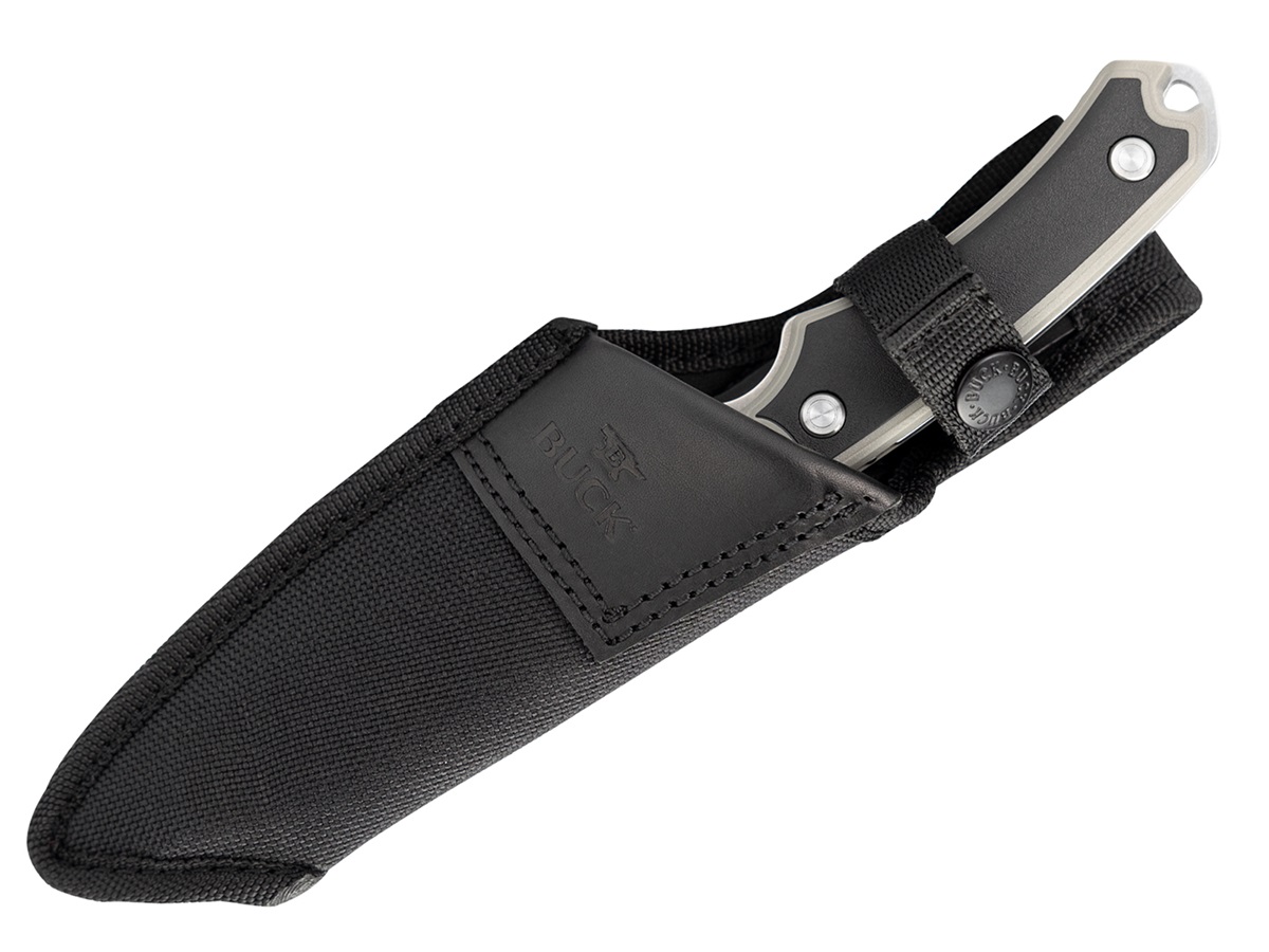 De Buck Alpha Guide Select is een outdoor mes met een moderne styling. Het mes is ontwikkeld om de alleskunner van het outdoor leven te zijn, perfect voor algemeen gebruik in de buitenlucht, als jachtmes, voor het slachten en fileren van vissen en klein wild, het bereiden van eten of het verwerken van houtjes (Niet geschikt voor batonneren). De Guide heeft een full-tang constructie en bestaat volledig uit stonewashed 420HC staal, deze staalsoort staat bekend om zijn taaiheid en uitstekende corrosiebestendigheid. Het heft van de Alpha Guide is gemaakt van glasvezel versterkt nylon (FRN), hierdoor is het mes lichtgewicht en eenvoudig te reinigen. Bovenop de FRN schalen is een rubberen laag aangebracht, dit verbeterd de grip zelfs in zeer veeleisende omstandigheden. De meegeleverde sheath met riemlus beschermt het mes tegen invloeden van buitenaf, om te zorgen dat het mes niet uit de sheath kan vallen is deze uitgerust met een drukknoopsluiting. Verder beschikt de Buck Alpha Guide over een koordoog.