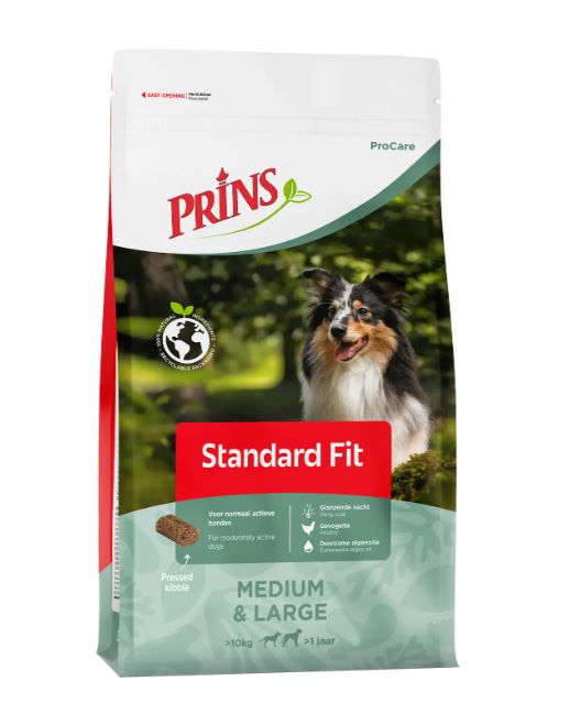 ProCare Standard Fit is een volledige geperste voeding voor volwassen honden tot circa 8 jaar met een gemiddeld energieverbruik. Dankzij een aangepast energiegehalte helpt deze voeding jouw hond in optimale conditie te blijven. De zorgvuldig geselecteerde ingrediënten dragen bij aan een gezonde huid en glanzende vacht, een optimale vertering en een evenwichtige darmflora.