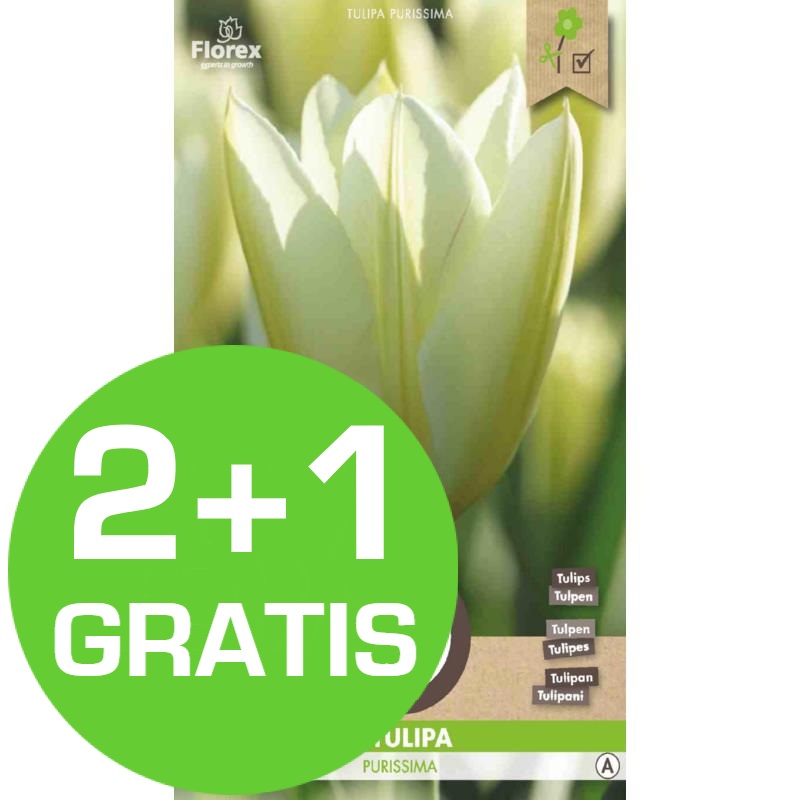 De tulp Purissima is een mooie witte tulp met een heel klein beetje crème. Purissima behoort tot de groep Fosteriana. Het is dus een vroeg bloeiende tulp met grote bloemen. Enkele vroege witte tulp. Hoogte ±50 cm. Bloeitijd is april.