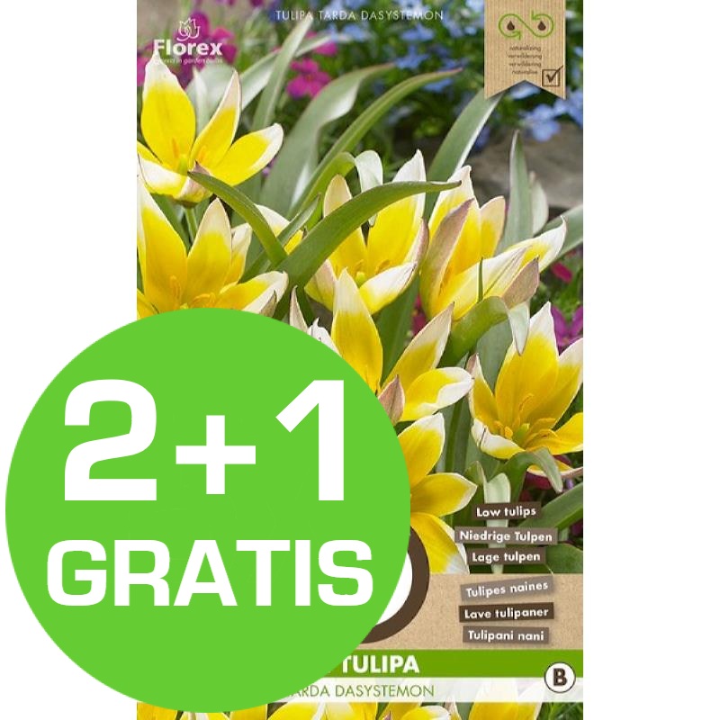 De Tulp Tarda is een geel-witte Botanische tulp en kunt u in groepjes in de tuin planten maar komen ook uitstekend tot hun recht in een rotstuin. Ze zijn zeer geschikt voor verwildering. Ze bloeien al vroeg en blijven laag. Planten in goed losgemaakte grond met de punten naar boven. Tot het planten droog en koel bewaren. Planttijd is in september tot en met december. Hoogte 10 cm.