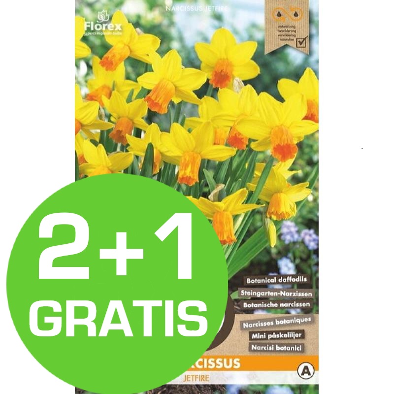 De Narcis Jetfire is een geel oranje Botanische narcis en is uitermate geschikt voor verwildering in rotstuinen maar staan ook prachtig in bloembakken. Ze zijn zeer geschikt voor verwildering. De bloeitijd is in maart en april. Planten in goed losgemaakte grond met de punten naar boven. Tot het planten droog en koel bewaren. Planttijd is in september tot en met december. Hoogte 20 cm