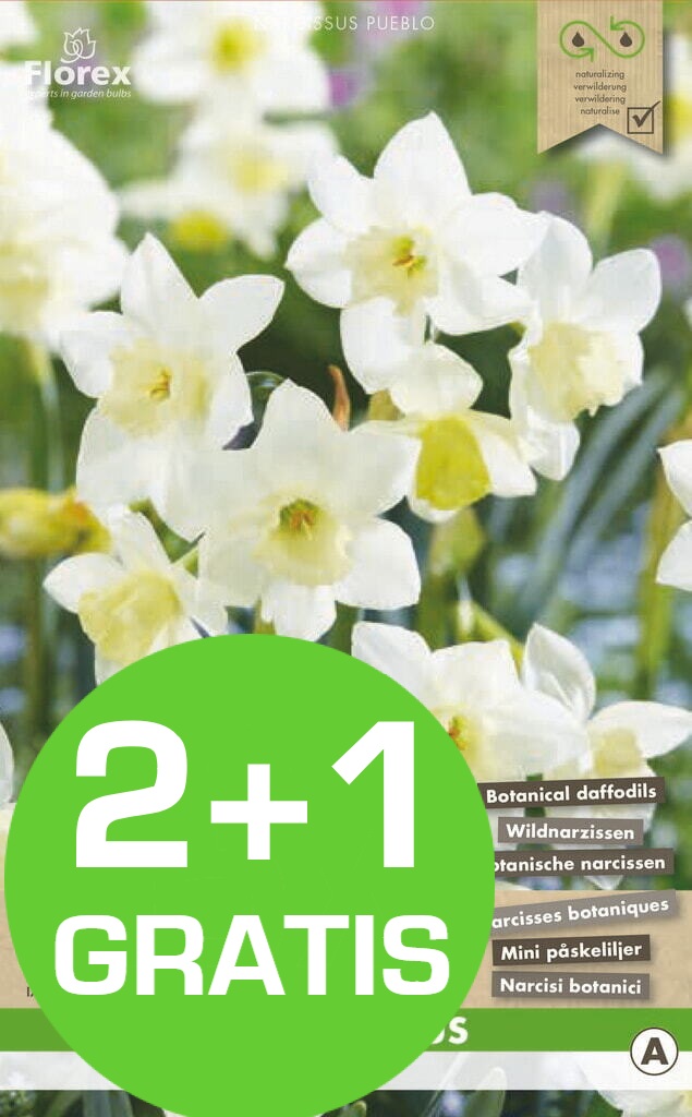 De narcis Pueblo is een heerlijk geurende witbloemige narcis met crèmekleurige kroon. Deze narcis bloeit in het voorjaar vanaf maart met meerdere bloemen per steel. Plant de bollen in het najaar vanaf september tot december nog voor de eerste strenge nachtvorst.
