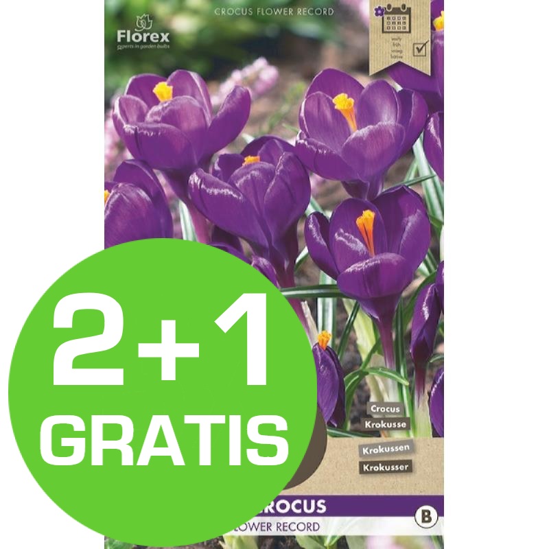 De crocusbollen bloeien vroeg in het voorjaar. De kleur van de bloem van de Flower Record crocusbol is paars met een helder oranje stampertje. Ze bloeien zowel in de zon als in de schaduw. De Flower Record crocusbollen doen het ook uitstekend in een pot of bak. Plant de bollen in september tot december ongeveer 5 cm diep en 3 tot 5 cm uit elkaar.