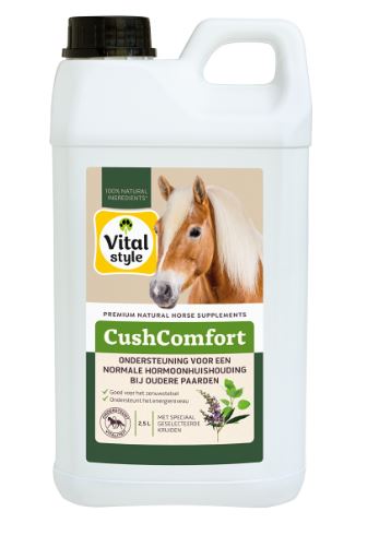 Vitalstyle CushComfort 2,5 liter biedt gerichte ondersteuning aan paarden met een verstoorde hormoonhuishouding, zoals bij PPID (ziekte van Cushing, hormonale aandoening bij oudere paarden).