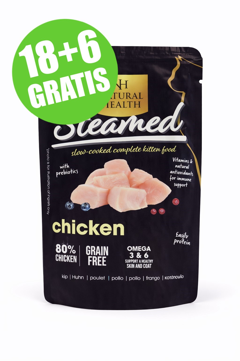 Natural Health Cat Steamed is een hoogwaardige, graanvrije natvoeding voor volwassen katten. Elke variant is bereid met zorgvuldig gestoomde ingrediënten van natuurlijke oorsprong, zoals vlees, vis, organen en bouillon. Dankzij het stoomproces blijven smaak, geur en voedingsstoffen behouden, wat zorgt voor een heerlijke en voedzame maaltijd. De toevoeging van gezonde oliën, kruiden en bessen ondersteunt de algehele gezondheid en vitaliteit van je kat.