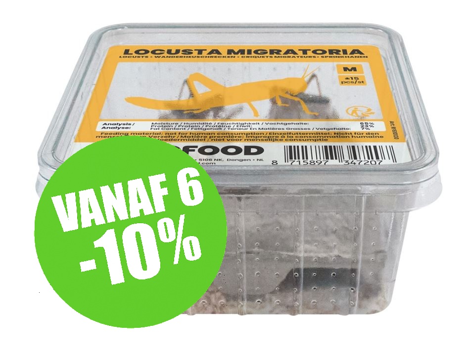 De sprinkhaan (Locusta Migratoria) staat bekend om zijn hoge voedingswaarde en is een gewaardeerd levend voer voor reptielenliefhebbers en eigenaren van exotische gezelschapsdieren. Met zijn hoge voedingswaarde en natuurlijke aantrekkingskracht biedt dit hartige insect een gezonde maaltijdoptie om de gezondheid en vitaliteit van je geliefde huisdieren te ondersteunen.