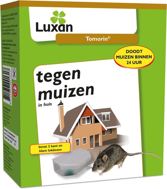 Luxan Tomorin 2x10 gram muizengif is een met pasta gevuld muizendoosje in kunststof ter bestrijding van muizen in gebouwen.PastalokaasTomorin bevat twee pastalokazen van 5 gram van een bijzonder aantrekkelijk lokaas.