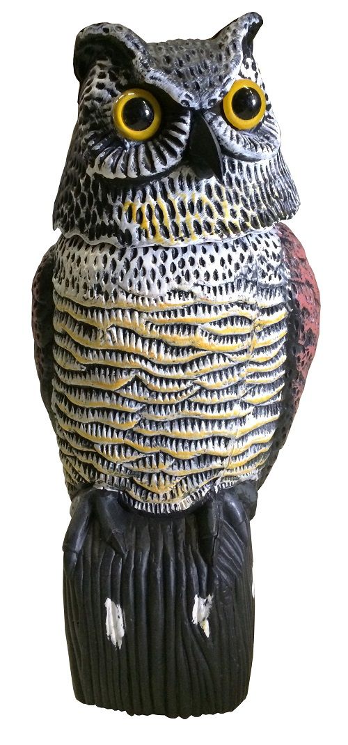 Om vogels of ongedierte te verjagen is een zichtbare plaats in de tuin gewenst. De kop beweegt mee met de wind en door lichtbronnen reflecteren de ogen, wat de levensechtheid benadrukt. Een zuchtje wind is al voldoende om de kop in beweging te krijgen.