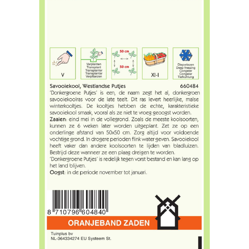 Zaaien: eind mei in de vollegrond. Zoals de meeste kool-soorten, kunnen ze 6 weken later worden uitgeplant. Zet ze op een onderlinge afstand van 50 x 50 cm. Zorg altijd voor voldoende vochtige grond. In drogere perioden fl ink water geven. Savooiekool heeft vaker dan andere koolsoorten te lijden van bladluizen. Bestrijd deze wanneer ze een plaag dreigen te worden. ‘Donkergroene Putjes’ is redelijk tegen vorst bestand en kan lang op het land blijven.