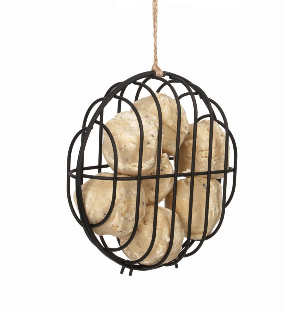 Vul de draadfeeder met mezenbollen naar keuze en hang deze op een beschutte plek in een tuin of op een terras/balkon.