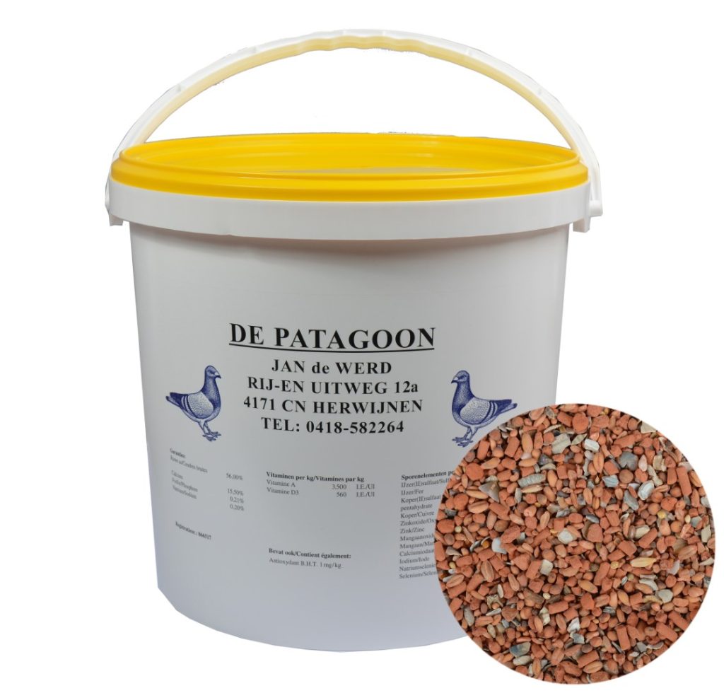 Samengesteld uit een mix van diverse gritsoorten, kalk en steen, roodsteen, onkruidzaad, een speciale p40 korrel (extra klein), diverse mineralen, 2 soorten maagkiezel, houtskool en nog een aantal ingrediënten, die door de duiven zeer graag gegeten wordt.