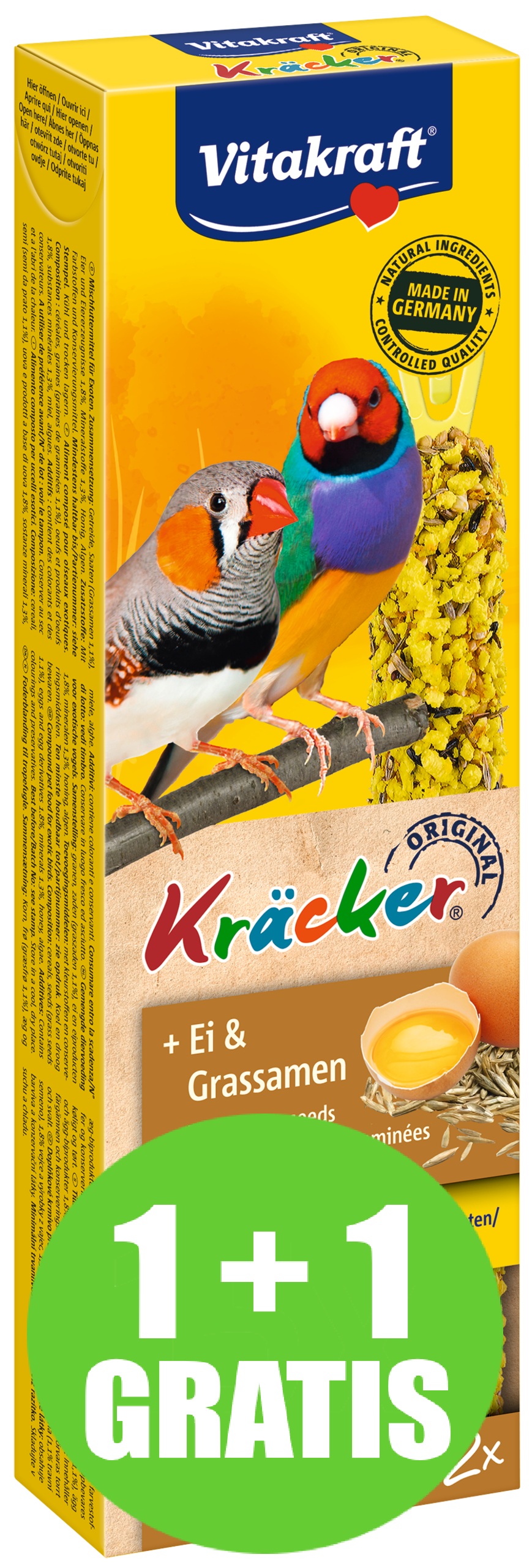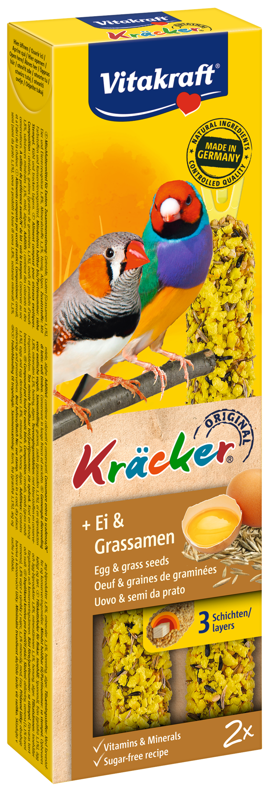 De originele Vitakraft Kräckers zijn een verantwoorde lekkernij en bevatten lekkere zaden, granen, graszaden en ei op een natuurlijk knabbelhoutje. De Kräckers zijn lekker van smaak en 3-voudig gebakken waardoor de ingrediënten stevig vastzitten en de exotische vogel bezig wordt gehouden zoals dit in de vrije natuur ook gebeurt. Dit zorgt ervoor dat de snavel van de exoot op natuurlijke wijze afslijt. De Kräckers zijn afgestemd op de voedingsbehoefte van de exotische vogel. Het Vital-Complex voorkomt gebreksverschijnselen en zorgt voor extra vitaliteit van het dier. De Kräckers bevatten waardevolle vitamines, zijn bereid volgens een suikervrije receptuur en zijn gemakkelijk in de kooi op te hangen door de cliphouder aan de Kräcker.