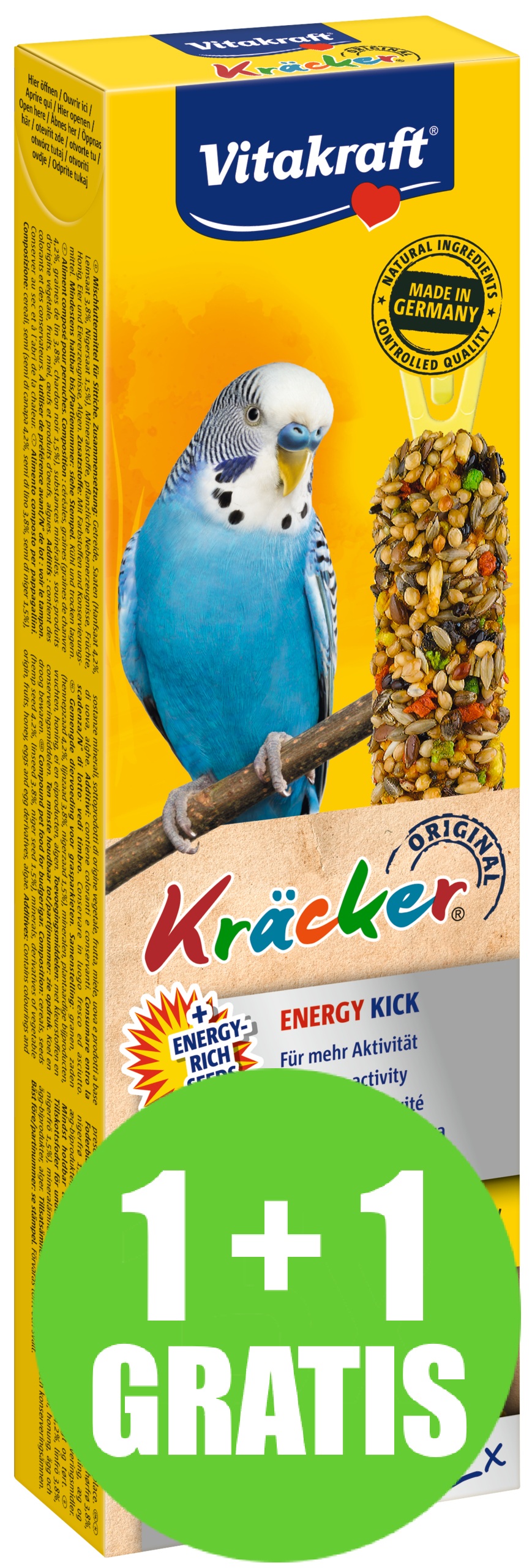 De functionele Vitakraft Kräckers zijn een verantwoorde lekkernij en bevatten lekkere zaden en granen op een natuurlijk knabbelhoutje. Deze functionele Kräcker bevat lijnzaad, hennepzaad en nigerzaad die rijk zijn aan energie voor meer activiteit van de parkiet. De Kräckers zijn lekker van smaak en 3-voudig gebakken waardoor de ingrediënten stevig vastzitten en de parkiet bezig wordt gehouden zoals dit in de vrije natuur ook gebeurt. Dit zorgt ervoor dat de snavel van de parkiet op natuurlijke wijze afslijt. De Kräckers zijn afgestemd op de voedingsbehoefte van de vogel. Het Vital-Complex voorkomt gebreksverschijnselen en zorgt voor extra vitaliteit van het dier. De Kräckers bevatten waardevolle vitamines, zijn bereid volgens een suikervrije receptuur en zijn gemakkelijk in de kooi op te hangen door de cliphouder aan de Kräcker.