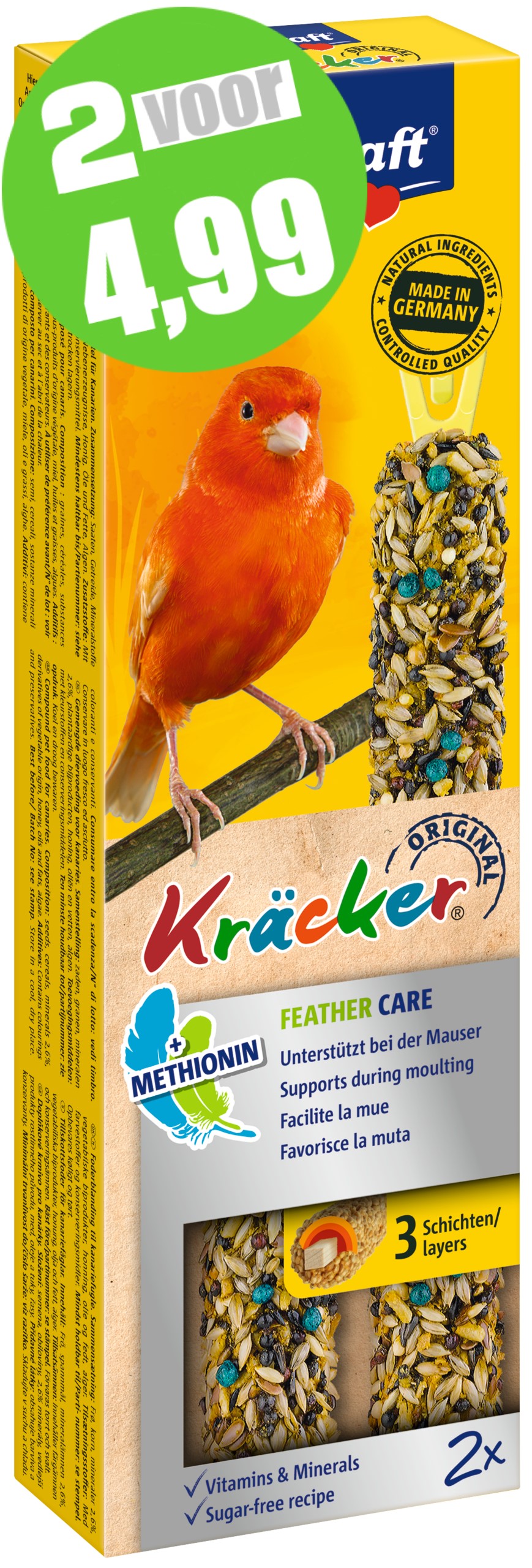 De functionele Vitakraft Kräckers zijn een verantwoorde lekkernij en bevatten lekkere granen en zaden op een natuurlijk knabbelhoutje. Deze functionele Kräcker bevat extra vitamines, mineralen en essentiële aminozuren welke de kanarie ondersteunen tijdens de rui. De Kräckers zijn lekker van smaak en 3-voudig gebakken waardoor de ingrediënten stevig vastzitten en de kanarie bezig wordt gehouden zoals dit in de vrije natuur ook gebeurt. Dit zorgt ervoor dat de snavel van de kanarie op natuurlijke wijze afslijt. De Kräckers zijn afgestemd op de voedingsbehoefte van de vogel. Het Vital-Complex voorkomt gebreksverschijnselen en zorgt voor extra vitaliteit van het dier. De Kräckers bevatten waardevolle vitamines, zijn bereid volgens een suikervrije receptuur en zijn gemakkelijk in de kooi op te hangen door de cliphouder aan de Kräcker.