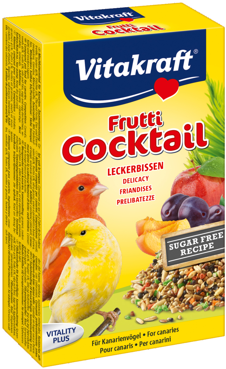 Frutti Cocktail voor de kanarie is een heerlijke traktatie en verwennerij. De knabbelmix is niet alleen lekker maar bevat ook waardevolle vitamines en voedingsstoffen. De Frutti Cocktail voegt variatie toe aan het dagelijkse rantsoen van de kanarie en bestaat uit lekkere vruchten zoals appel, pruim en abrikoos en zongerijpte zaden welke een goede, gezonde energiebron zijn. De geselecteerde ingrediënten maken de Fruit cocktail een smakelijke voeding, ter aanvulling van de hoofdvoeding. De Frutti Cocktail is bereid volgens een suikervrije receptuur en zonder kunstmatige smaakversterkers en conserveringsmiddelen.