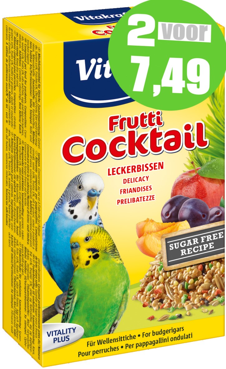 Frutti Cocktail voor de parkiet is een heerlijke traktatie en verwennerij. De knabbelmix is niet alleen lekker maar bevat ook waardevolle vitamines en voedingsstoffen. De Frutti Cocktail voegt variatie toe aan het dagelijkse rantsoen van de parkiet en bestaat uit lekkere vruchten zoals appel, pruim en abrikoos en zongerijpte zaden welke een goede, gezonde energiebronzijn. De geselecteerde ingrediënten maken de Fruit cocktail een smakelijke voeding, ter aanvulling van de hoofdvoeding. De Frutti Cocktail is bereid volgens een suikervrije receptuur en zonder kunstmatige smaakversterkers en conserveringsmiddelen.