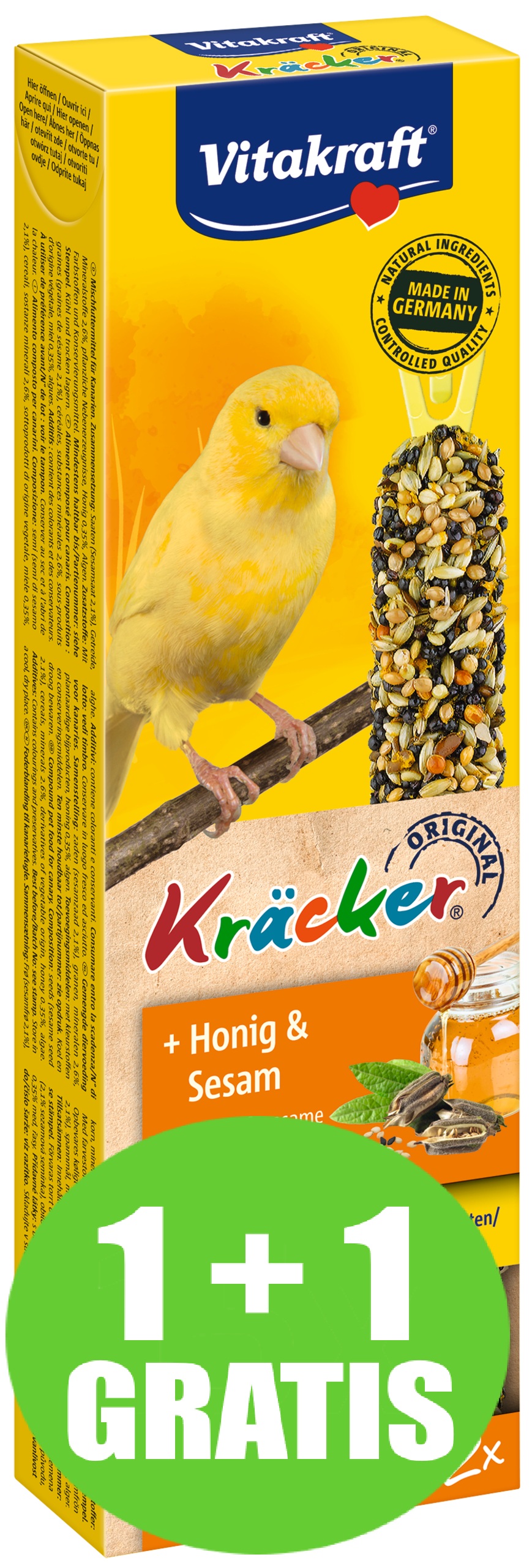 De originele Vitakraft Kräckers zijn een verantwoorde lekkernij en bevatten lekkere granen, zaden, honing en sesam op een natuurlijk knabbelhoutje. De Kräckers zijn lekker van smaak en 3-voudig gebakken waardoor de ingrediënten stevig vastzitten en de kanarie bezig wordt gehouden zoals dit in de vrije natuur ook gebeurt. Dit zorgt ervoor dat de snavel van de kanarie op natuurlijke wijze afslijt. De Kräckers zijn afgestemd op de voedingsbehoefte van de vogel. Het Vital-Complex voorkomt gebreksverschijnselen en zorgt voor extra vitaliteit van het dier. De Kräckers bevatten waardevolle vitamines, zijn bereid volgens een suikervrije receptuur en zijn gemakkelijk in de kooi op te hangen door de cliphouder aan de Kräcker.