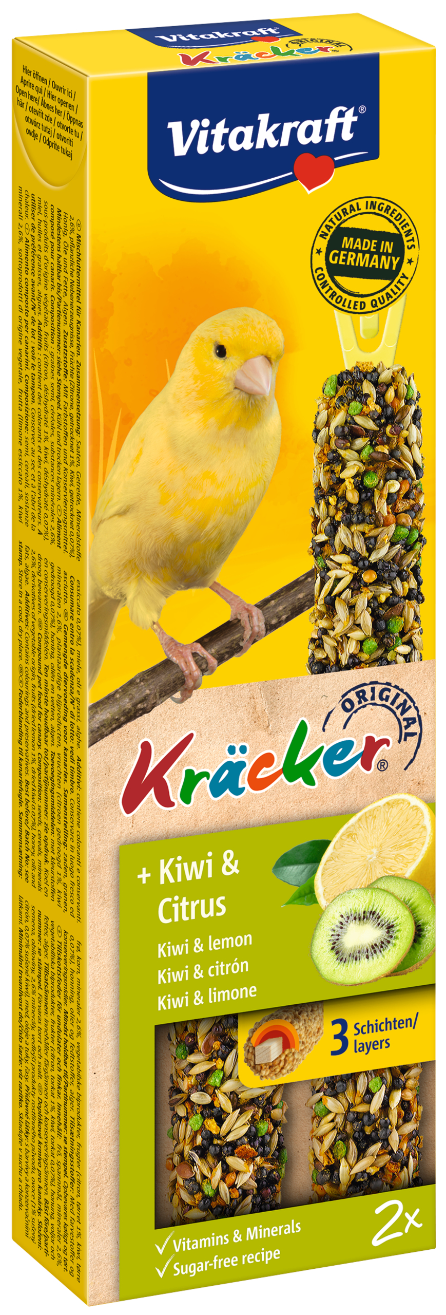 De originele Vitakraft Kräckers zijn een verantwoorde lekkernij en bevatten lekkere granen, zaden, kiwi en citrus op een natuurlijk knabbelhoutje. De Kräckers zijn lekker van smaak en 3-voudig gebakken waardoor de ingrediënten stevig vastzitten en de kanarie bezig wordt gehouden zoals dit in de vrije natuur ook gebeurt. Dit zorgt ervoor dat de snavel van de kanarie op natuurlijke wijze afslijt. De Kräckers zijn afgestemd op de voedingsbehoefte van de vogel. Het Vital-Complex voorkomt gebreksverschijnselen en zorgt voor extra vitaliteit van het dier. De Kräckers bevatten waardevolle vitamines, zijn bereid volgens een suikervrije receptuur en zijn gemakkelijk in de kooi op te hangen door de cliphouder aan de Kräcker.