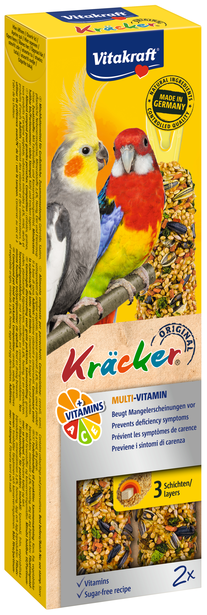 De functionele Vitakraft Kräckers zijn een verantwoorde lekkernij en bevatten lekkere zaden en granen op een natuurlijk knabbelhoutje. Deze functionele Kräcker bevat extra vitamine A, C en E die tekorten voorkomen en het immuunsysteem van de valkparkiet ondersteunen. De Kräckers zijn lekker van smaak en 3-voudig gebakken waardoor de ingrediënten stevig vastzitten en de valkparkiet bezig wordt gehouden zoals dit in de vrije natuur ook gebeurt. Dit zorgt ervoor dat de snavel van de valkparkiet op natuurlijke wijze afslijt. De Kräckers zijn afgestemd op de voedingsbehoefte van de vogel. Het Vital-Complex voorkomt gebreksverschijnselen en zorgt voor extra vitaliteit van het dier. De Kräckers bevatten waardevolle vitamines, zijn bereid volgens een suikervrije receptuur en zijn gemakkelijk in de kooi op te hangen door de cliphouder aan de Kräcker.